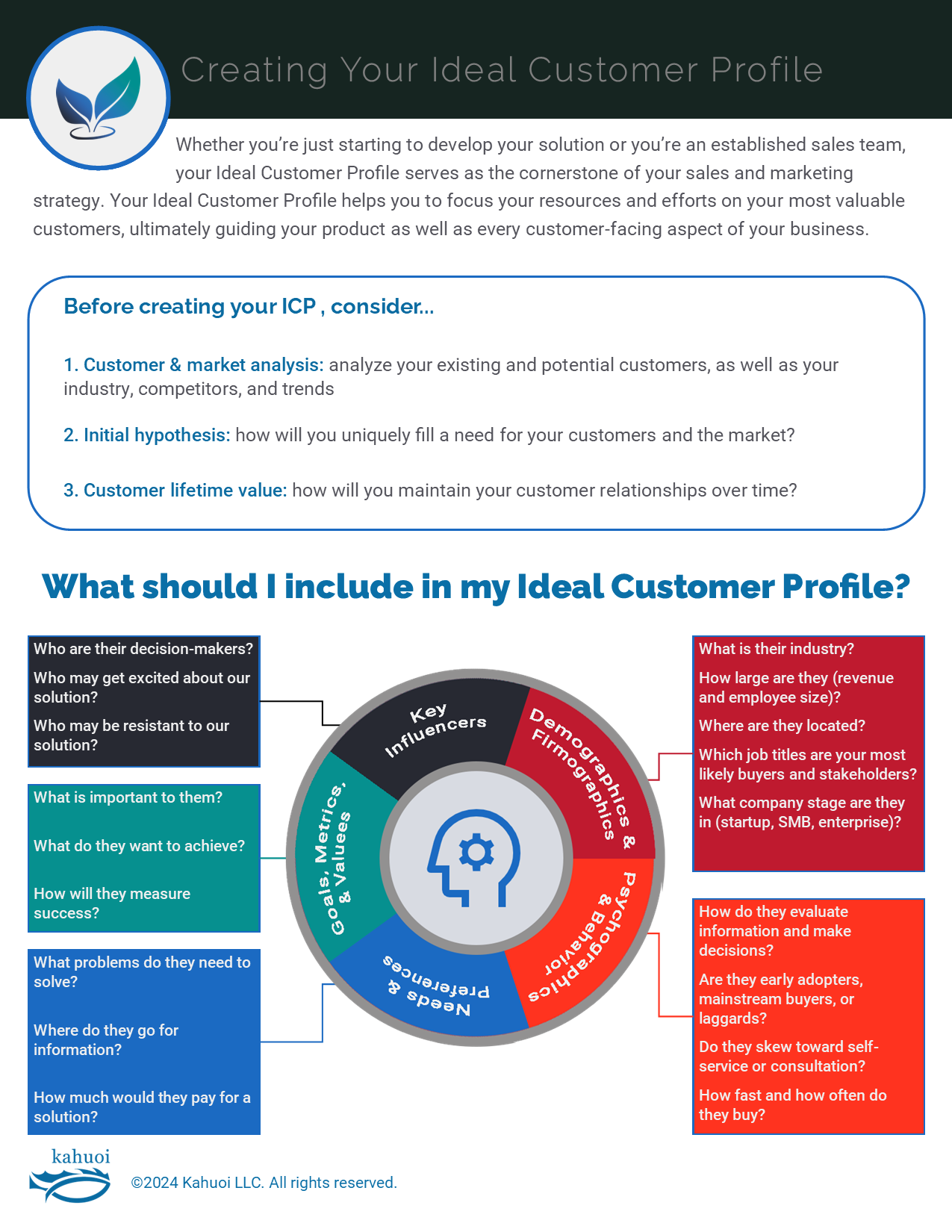 examples: industry, geography, company stage (e.g. startup, SMB, enterprise), company size (revenue and employee count), common job titles and roles of buyers and stakeholders
